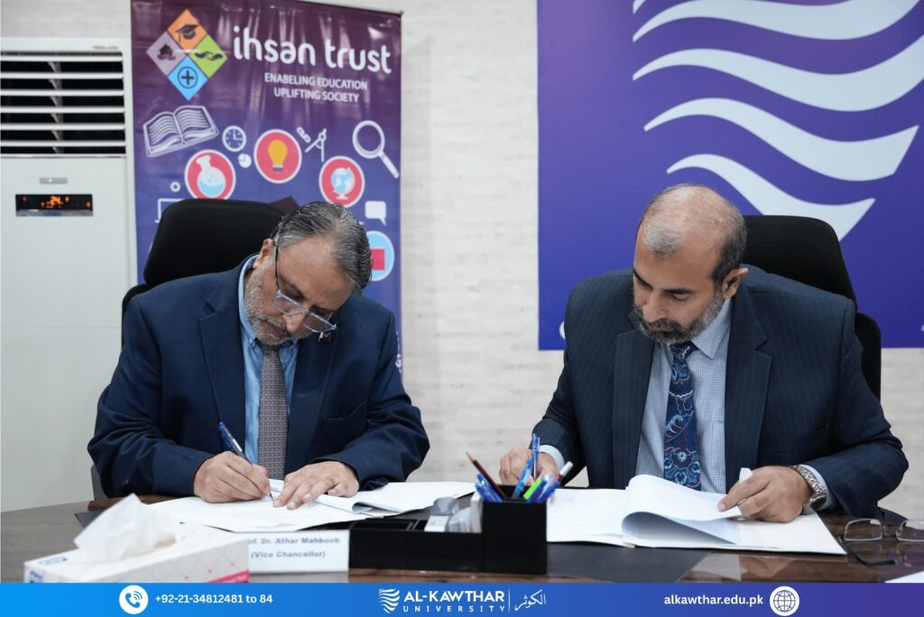 The MoU was formally signed by Prof. Dr. Athar Mahboob – Vice Chancellor Al-Kawthar University and Mr. Fayyaz Ur Rehman Khan – General Manager Ihsan Trust.
