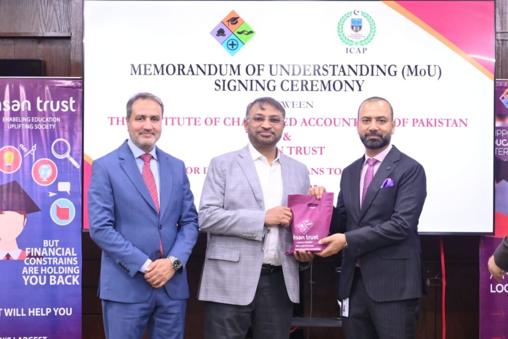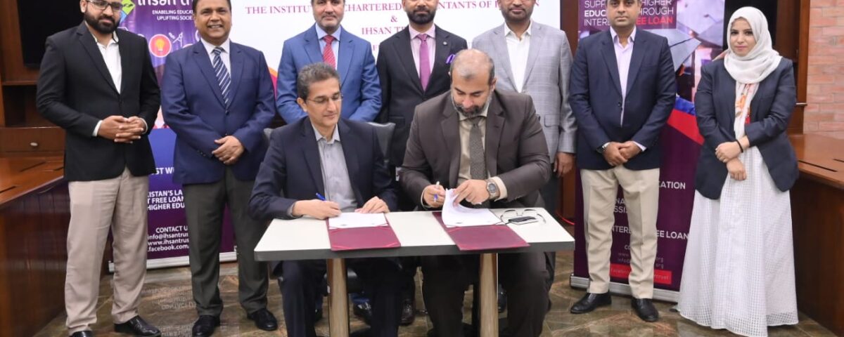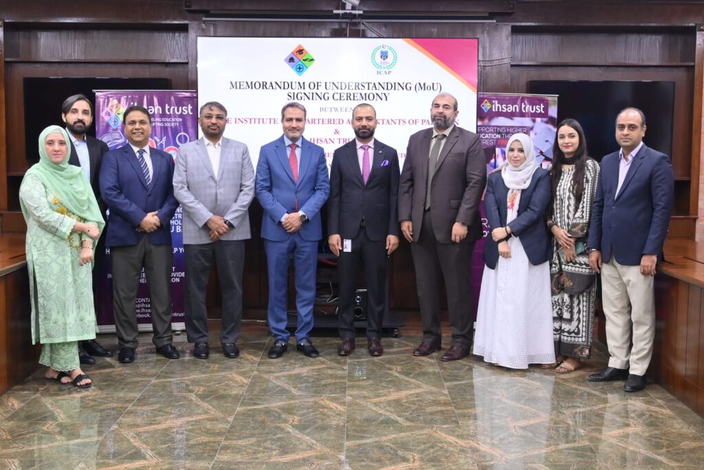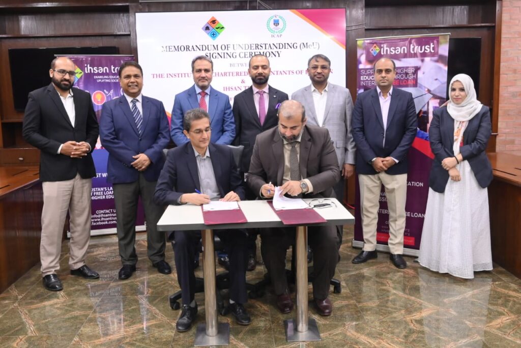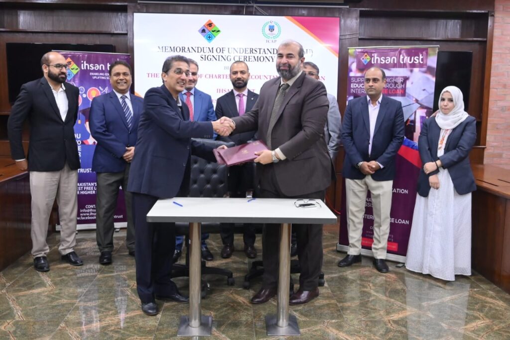 On July 02, 2025, a Memorandum of Understanding (MoU) has been signed between Ihsan Trust (IT) and Institute of Chartered Accountacnt of Pakistan (ICAP) to provide the Interest-Free Loan facility to the deserving students pursuing their Chartered Accountancy from ICAP for their Examination fee, Registration fee etc on purely “Need-Cum-Merit” basis.